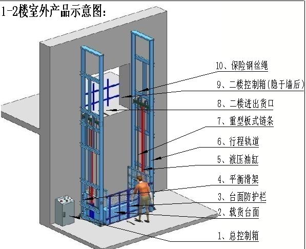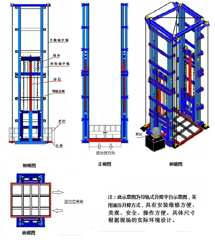 導(dǎo)軌式升降機(jī)是一種非剪叉式液壓升降機(jī)設(shè)備·用于二三層工業(yè)廠房,餐廳,酒樓樓層間的貨物傳輸·低高度在150-300mm,優(yōu)其適合不能開挖地坑的工作場所·并且無須上部吊點,形式多樣化(單柱,雙柱,四柱).設(shè)備運(yùn)行平穩(wěn),導(dǎo)軌式升降機(jī)的導(dǎo)軌一般為方管、H鋼,方管焊接制成,操作簡單可靠,貨物傳輸經(jīng)濟(jì)便捷· 大承載10噸,實現(xiàn)多點控制,上下樓層互動聯(lián)鎖,達(dá)到安全使用;提升高度高,采用旁置油缸、或雙測式油缸,運(yùn)行平穩(wěn)、無噪聲、維修方便、使用壽命較長;停電手動下降、緊急停止按鈕,方便、快捷、實用; 地坑深度一般為15cm-30cm,頂層高度不受限制,可根據(jù)現(xiàn)場環(huán)境定做用;層門可貫通,廠房內(nèi)外可相互戳開,方便、節(jié)省空間;特別適合2-3層鋼結(jié)構(gòu)廠房,內(nèi)外部均可使用。