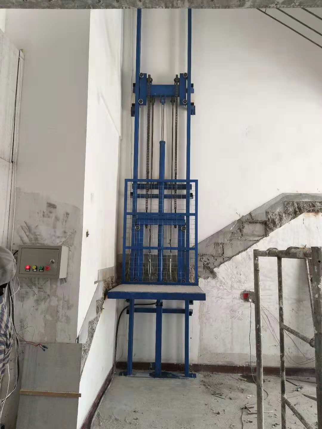 導(dǎo)軌式液壓升降機(jī)主要是有建筑物或輕型鋼結(jié)構(gòu)所圍成的封閉式或網(wǎng)狀式井道并用液壓驅(qū)動(dòng)油缸頂升平臺(tái)。其主要組成部分為: